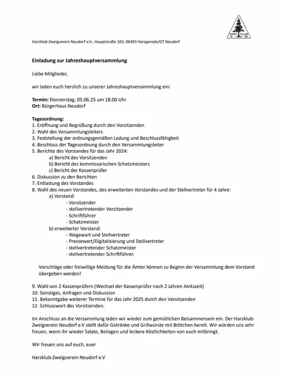 - 05.06.2025 Jahreshauptversammlung mit Wahl 18 Uhr